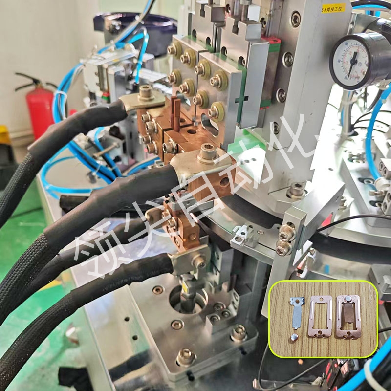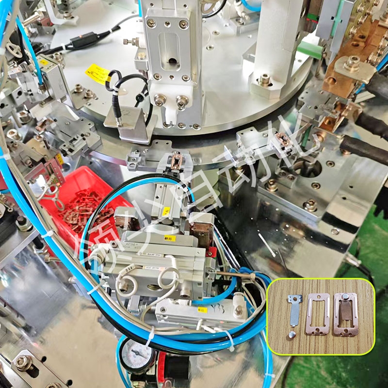 专为可调温控器行业定制;大小弹片分别进料后焊接在一起,触点穿入,旋铆,下料;焊接稳定,旋铆较直冲工艺,开关过电流一致性好;可定制同类旋铆工艺的其他行业设备。