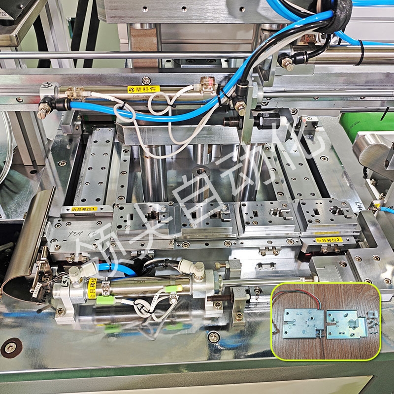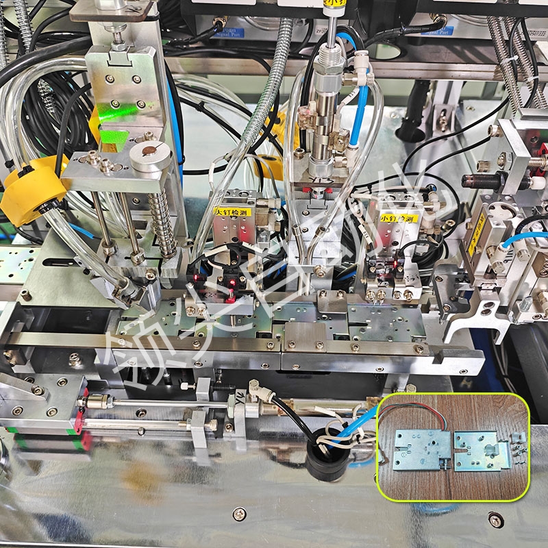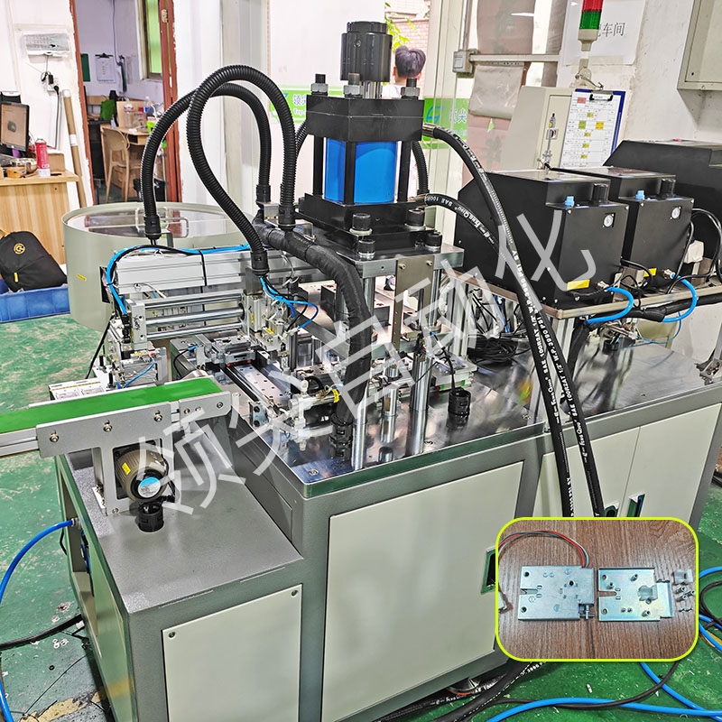 此设备专为电子锁行业定制;铁盖采用皮带线送料,铆钉,胶座分别自动进料;采用油缸,冷压将铆钉压入铁盖中,稳定性好,效率高;预留后工序设备接口。